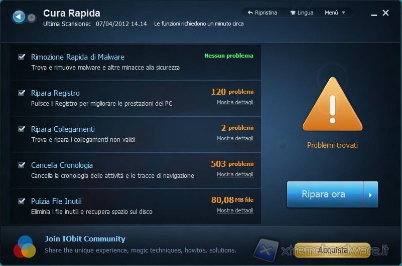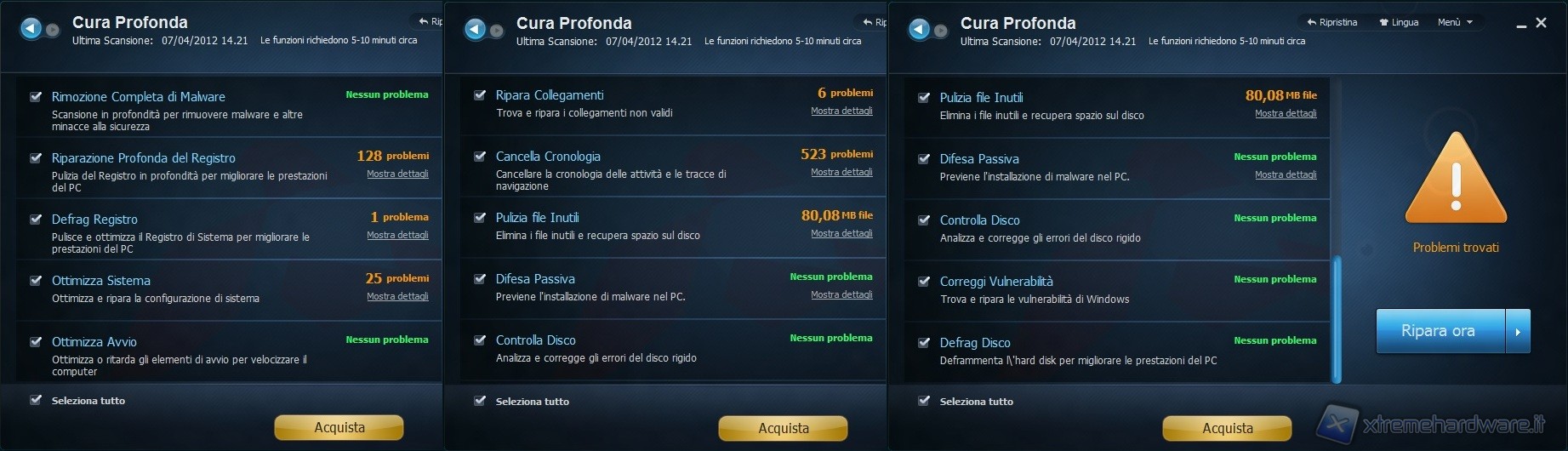 Come evidenziato nei test eseguiti su Windows 7, i metodi di rilevazione e pulizia nella modalità Cura Rapida sono i medesimi sia per la versione gratuita che a pagamento.